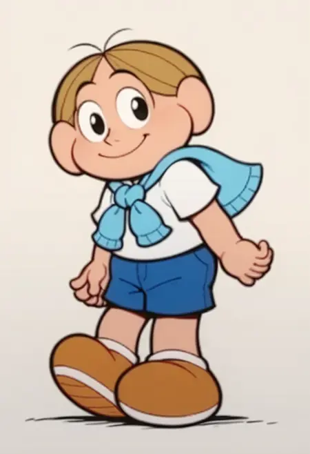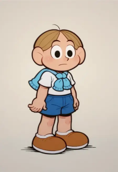 MetildoTDM, 1boy, beige hair cut and slicked to both sides with a little strand sticking up, blue blouse tied around neck, dark blue shorts, white shirt, brown shoes, black eyes, short,