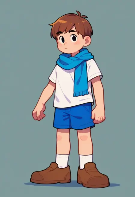 metildo, short hair, shirt, brown hair, 1boy, white shirt, short sleeves, shorts, shoes, socks, black eyes, white socks, brown footwear, blue shorts, blue scarf