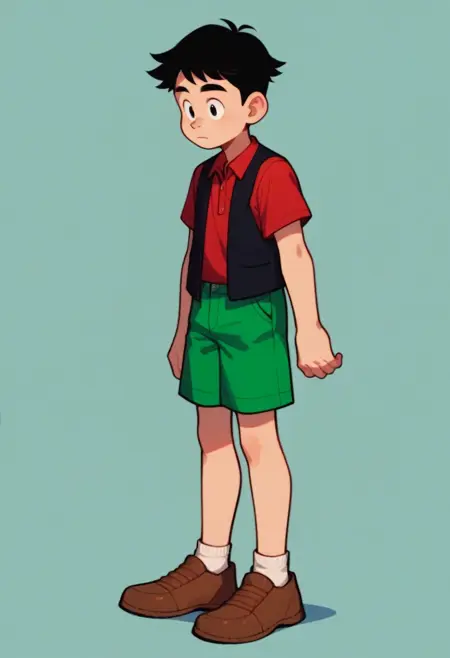 alfacinha, short hair, shirt, black hair, 1boy, short sleeves, shorts, shoes, black vest, brown footwear, red shirt, green shorts, green pants