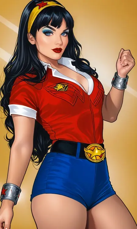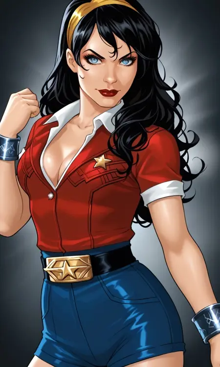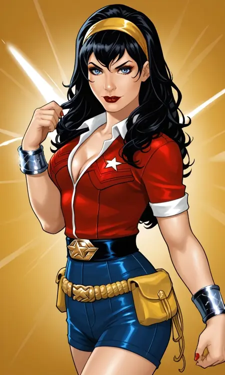 1girl,long hair,black hair,yellow hairband,blue eyes,makeup,collared shirt,red shirt,short sleeves,belt,blue shorts,silver bracelets,high-waist shorts