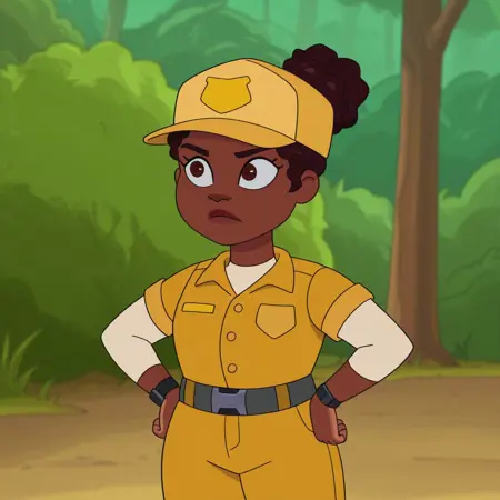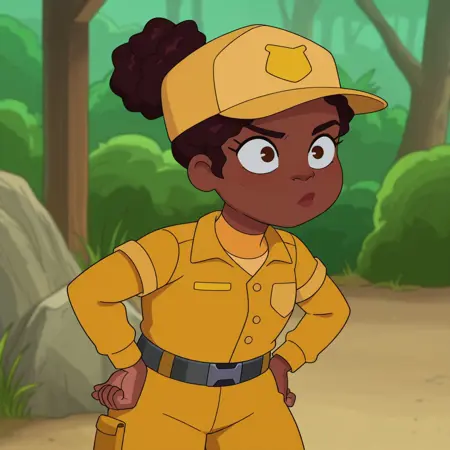 yellow service shirt,pale orange undershirt,belt, PR Pants, Brown hair, Hair bun,park-ranger outfit, yellow headwear