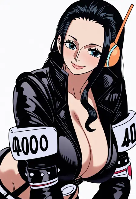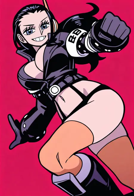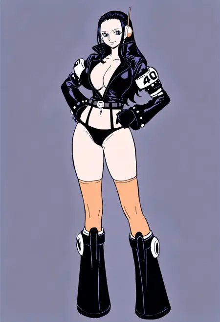 基础提示:1girl, nico robin, blue eyes, black hair slicked back, long hair服装提示:jacket, orange thighhighs, cleavage, large breasts, black gloves, midriff, navel, black panties, black knee boots