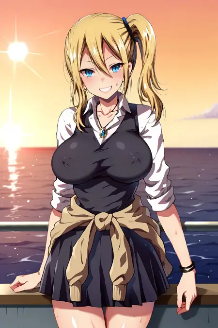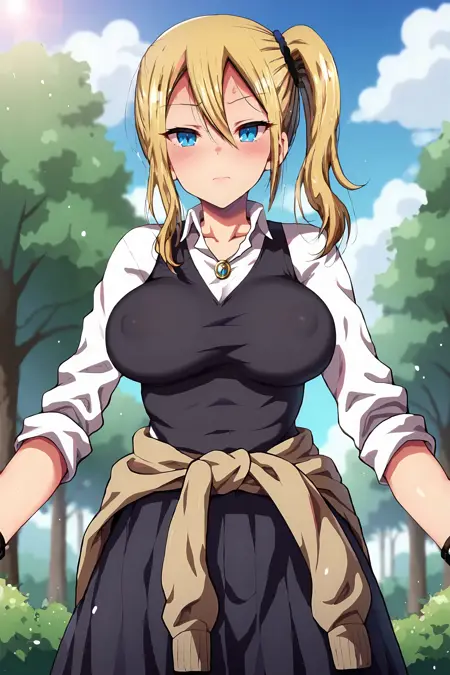 긴 소매, 칼라 셔츠, 목걸이, 스웨터, 허리에 둘러싼 옷, 허리에 둘러싼 스웨터, 무릎높이 양말, 로퍼, 쓰우치인 학교 교복, 팔찌, 소매 말아올린, 관자뼈, 피나포어 드레스, 검은 드레스, 검은 베스트, 흰색 언더셔츠, 열린 칼라