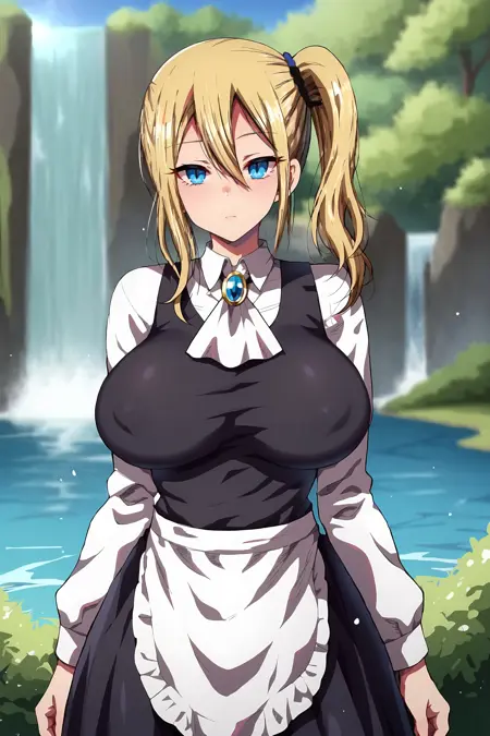 アスコット、ホワイトアスコット、長袖、エプロン、ホワイトエプロン、ロングエプロン、ウエストエプロン、秀知院学園制服、シャツ、ブラックドレス、ブラックベスト、エプロンドレス、ロングドレス、ロングスカート、ホワイトアンダーシャツ、ブローチ