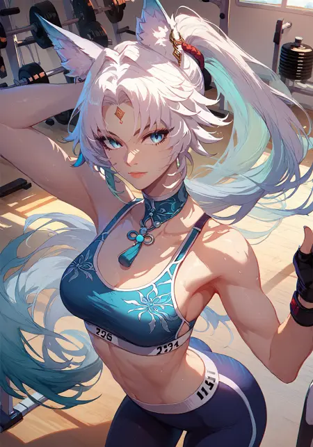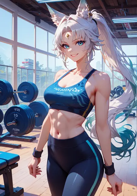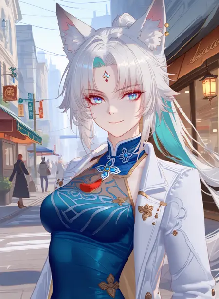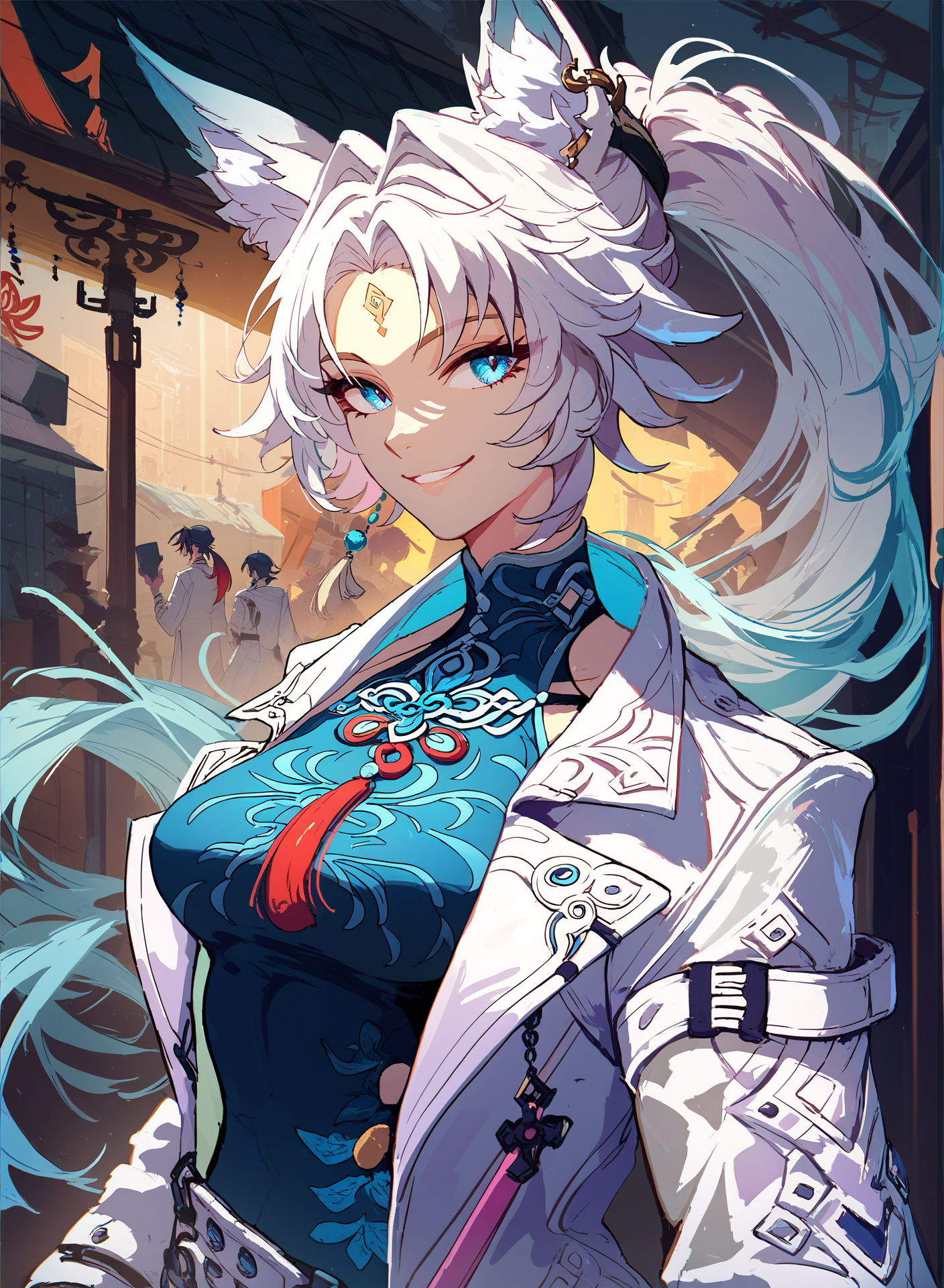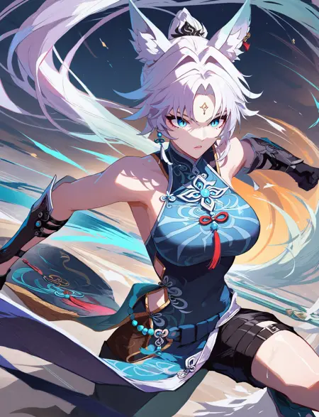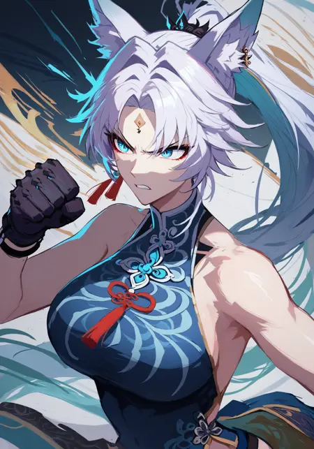 feixiao, animal ears, animal ear fluff, white hair, two-tone hair, forehead mark, ponytail, blue eyes,