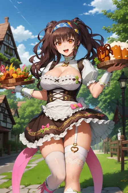 サマートースト衣装(モバイルゲームより) - ドイツ風衣装, フリル付きドレス, フリルスカート, シングルシーストッキング, ヘッドバンド, ガーターストッキング, マッチしない靴下, フィッシュネットストッキング, ウエイトレス, ライターアップトップ, パフスリーブ, ピンクのシューズ