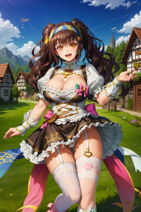 • Summer Toast Outfit (from mobile game) - german clothes, frilled dress, frilled skirt, single thighhigh, headband, garter straps, mismatched legwear, fishnet thighhighs, waitress, cross-laced top, puffy short sleeves, pink footwear