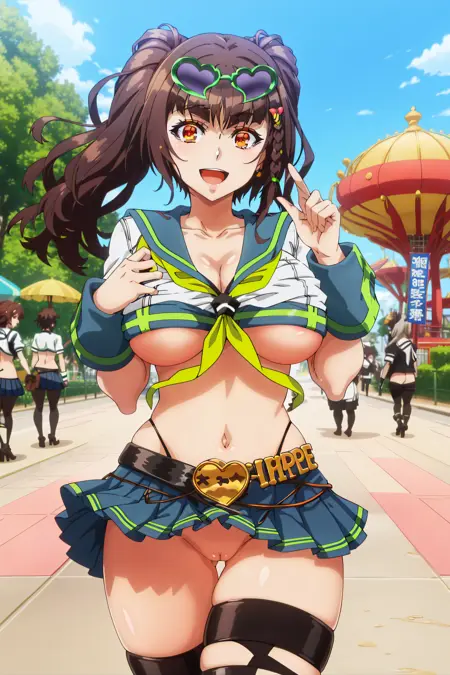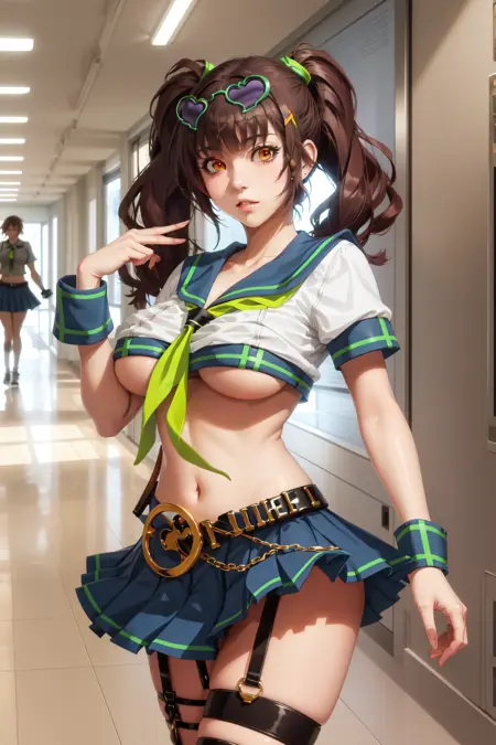 メイン衣装 - セーラー服, プリーツスカート, ファンデーション, 黒いベルト, 太ももストラップ, ウォッチバンド, 心型メガネ, 白いソックス, 黒い靴