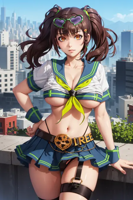 • Main Outfit - serafuku, pleated skirt, underboob, black belt, thigh strap, wristband, heart-shaped eyewear, white socks, black shoes