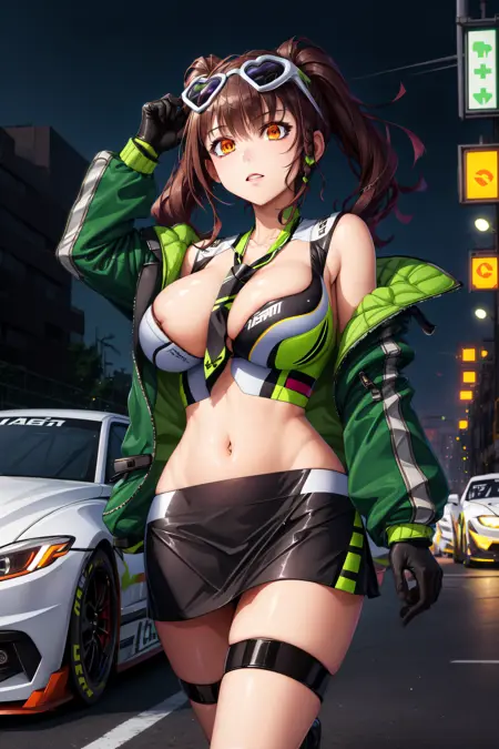 • Speedrunner Outfit (from mobile game) - green jacket, necktie, black miniskirt, bare shoulders, race queen, eyewear on head, black gloves, navel, white thigh boots
