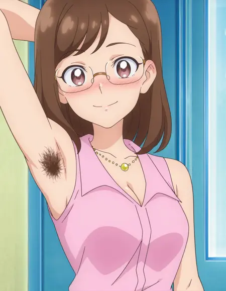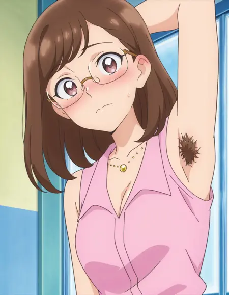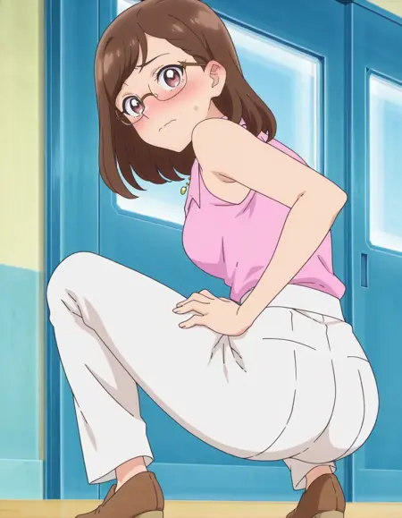 score_9, score_8_up, score_7_up, anime screencap,1girl,solo,glasses, brown eyes, brown hair, sleeveless, necklace, jewelry,pink shirt,white pants, lora:SakuragawaSaki:0.8