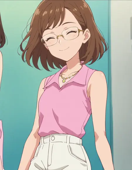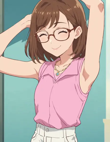 score_9, score_8_up, score_7_up, anime screencap,1girl,solo,glasses, brown eyes, brown hair, sleeveless, necklace, jewelry,pink shirt,white pants, lora:SakuragawaSaki:0.8