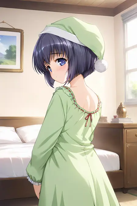 pajamas,sleepwear,nightcap,green headwear,pom poms,negligee,green dress,ribbon-trimmed dress,pink ribbon,oblong neck,long sleeves,barefoot,