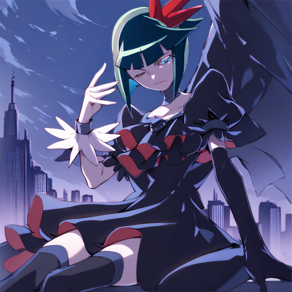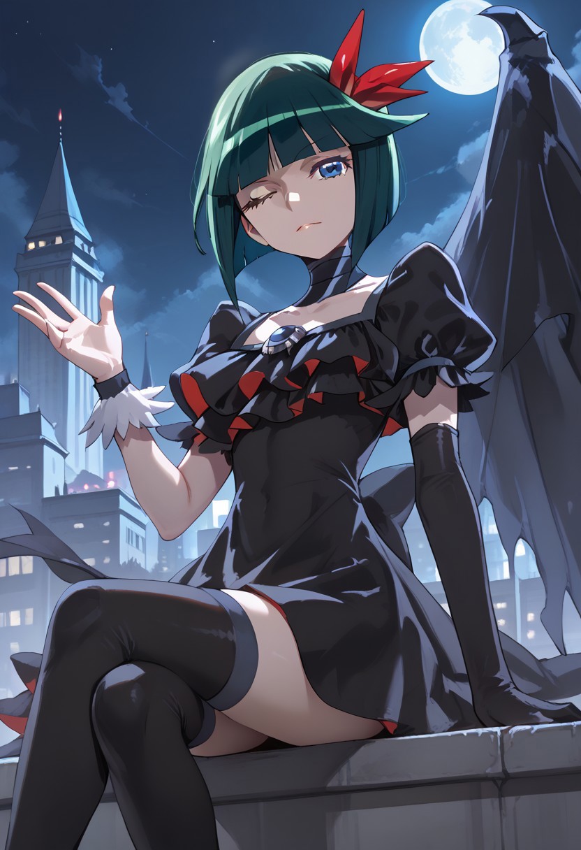 Single hand black long gloves, , single wing, black dress, stockings , boots
