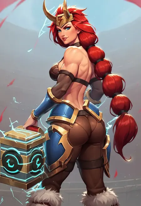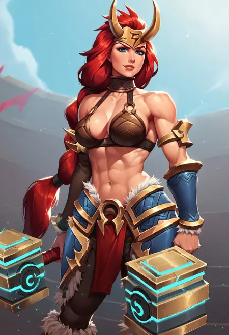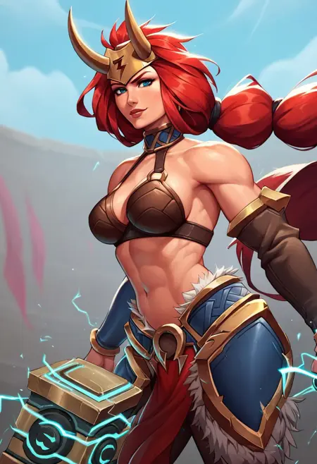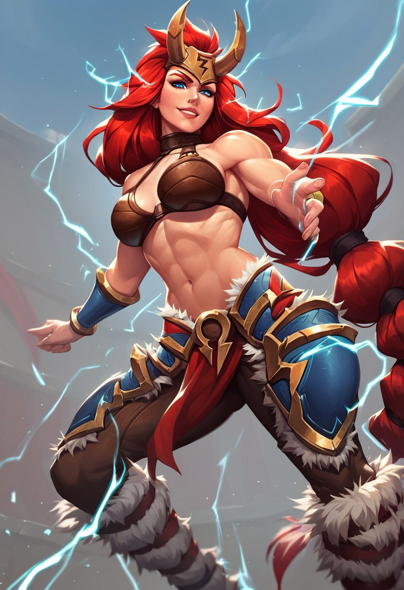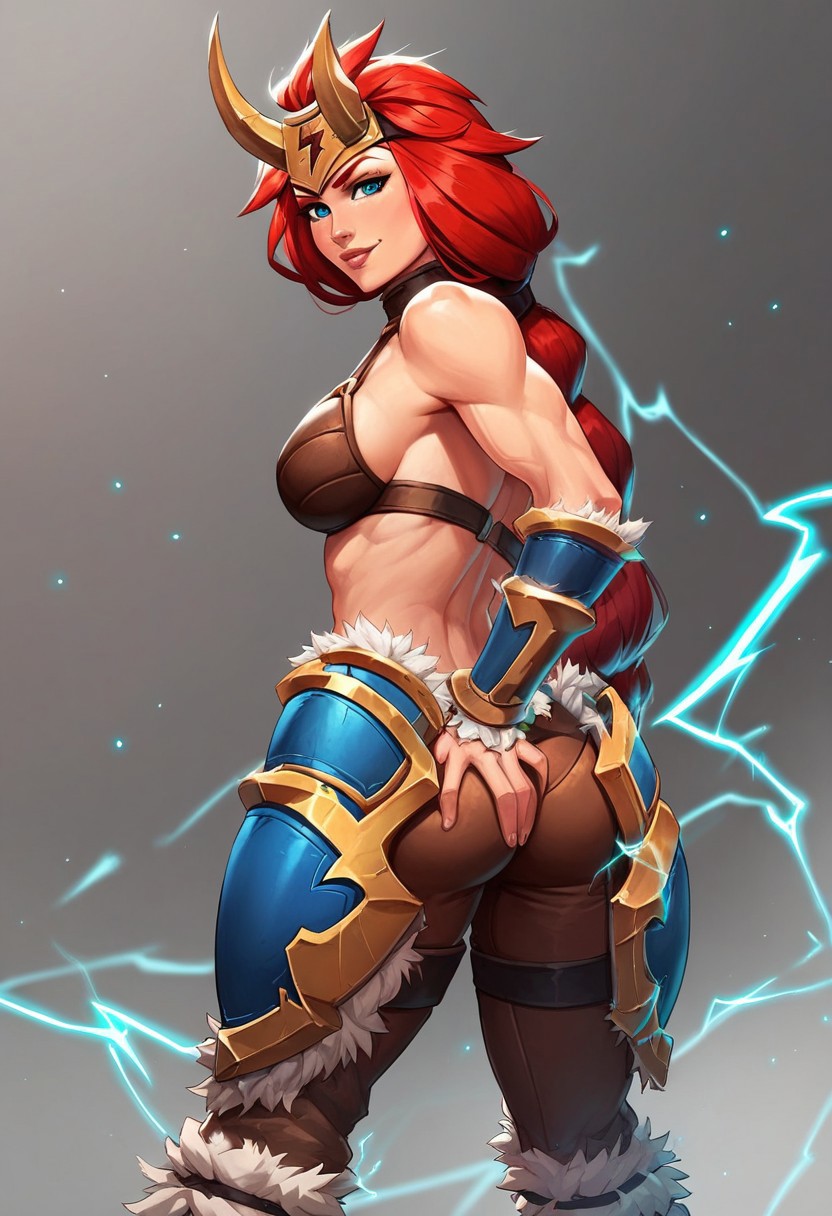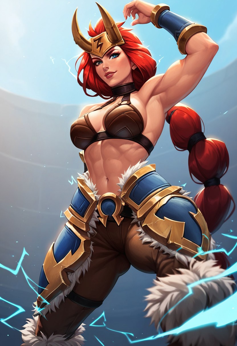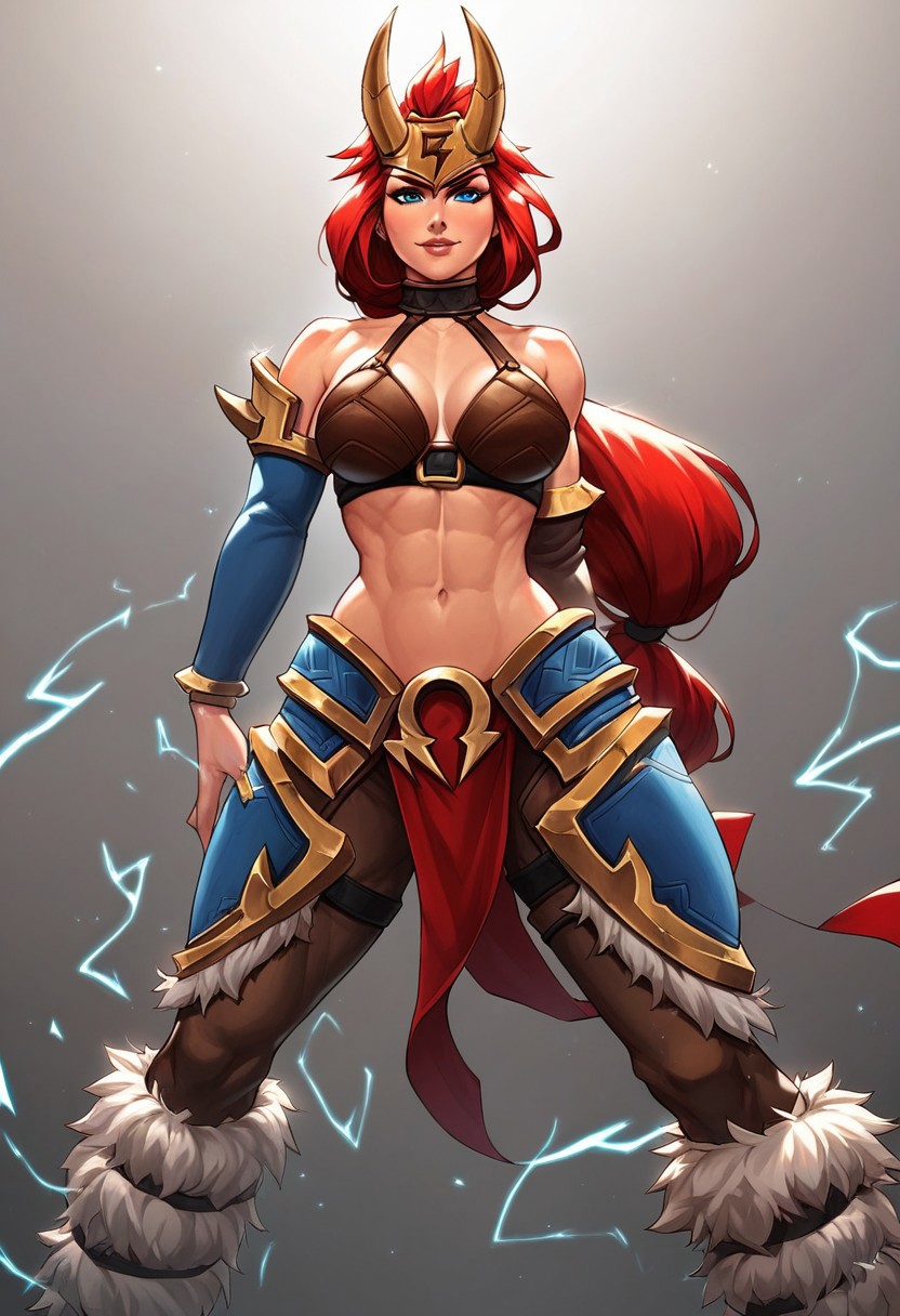 FreyaBattlerite,1girl,solo, 赤毛,長髪,長い編み込み,アーマー,大きい胸,角,へそ,青い目,裸の肩,胸元,筋肉質な女性,二頭筋,腹筋,ハンマー,ブーツ,ズボン,お腹,毛皮のフリンジ,ファウルズ,電気,ブレーサー,ヘルメット,骨盤カーテン,ビキニアーマー,