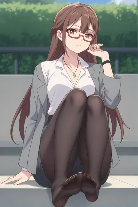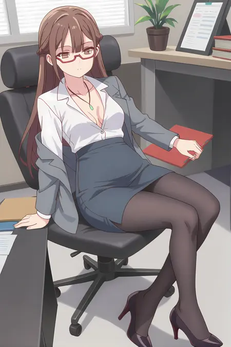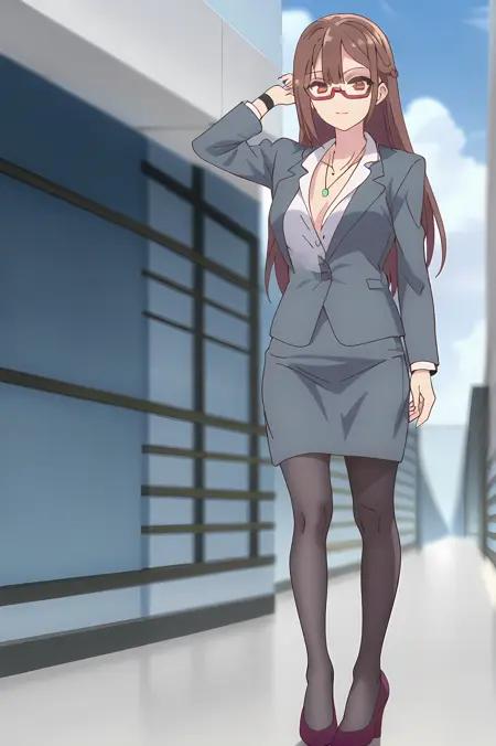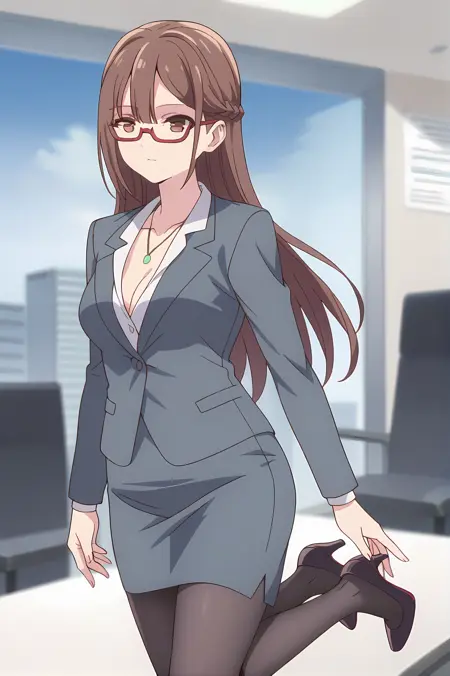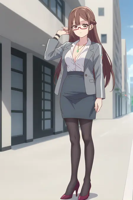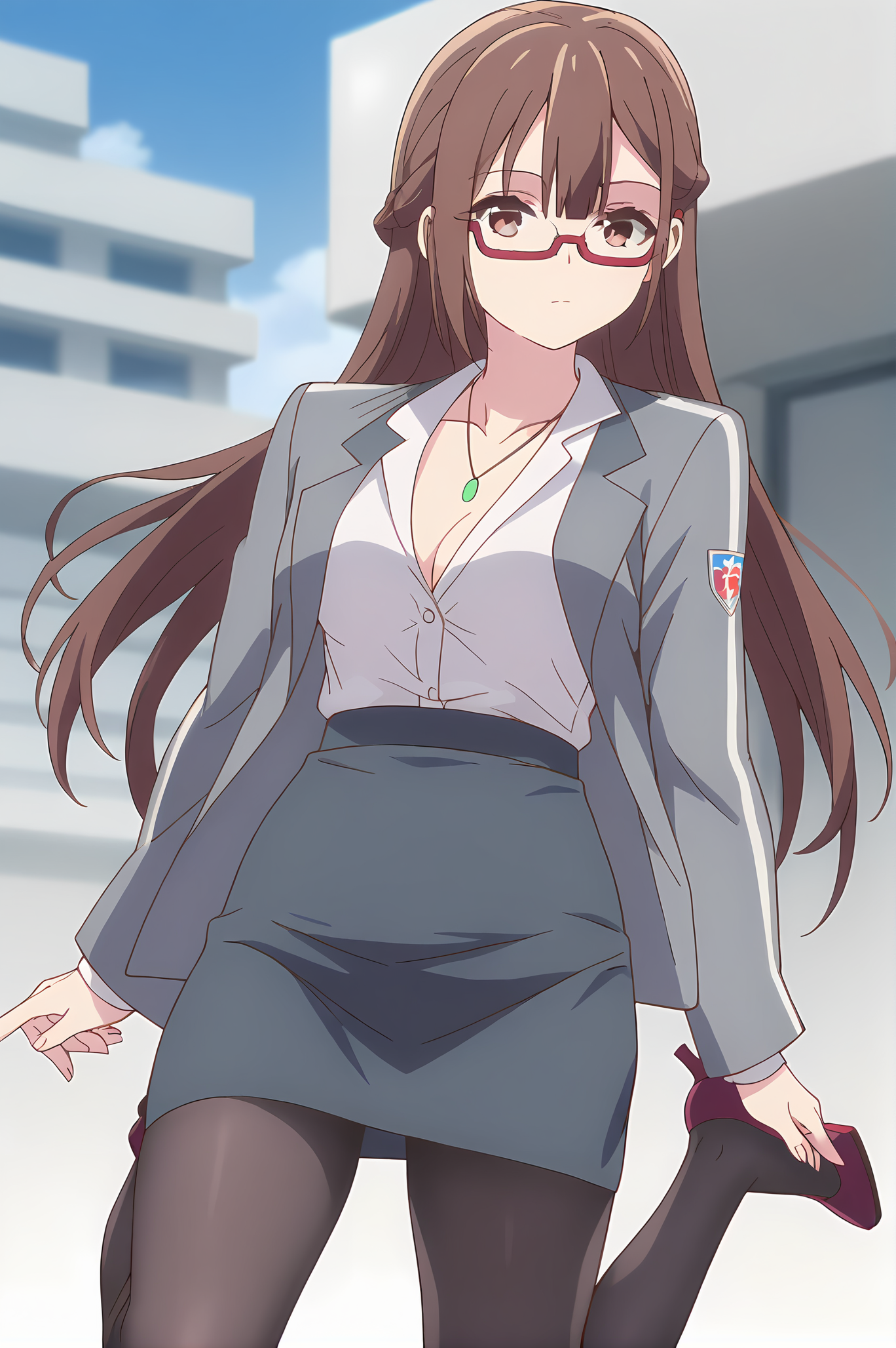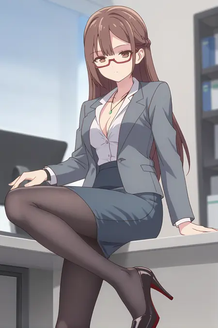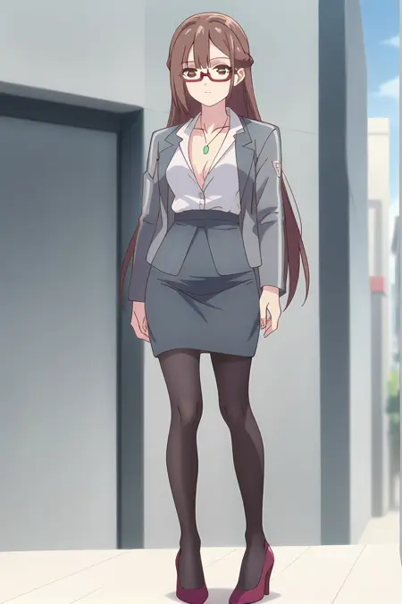 회색 자켓, 흰색 셔츠, 연필 치마, 검은 팬티스타킹, 하이힐