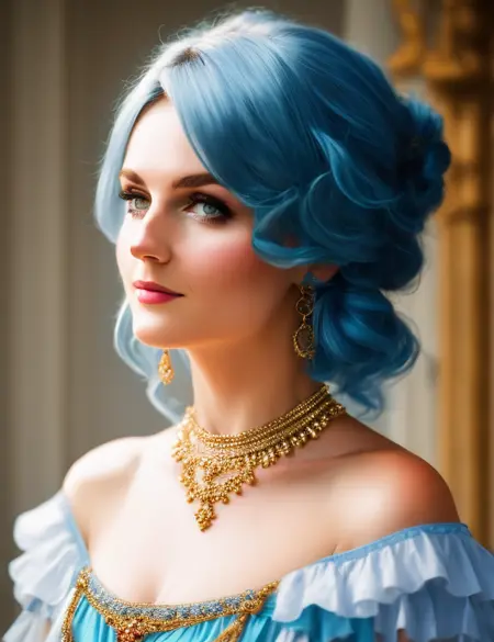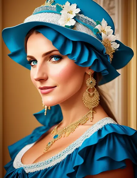 一张特写,人物肖像,一位身穿蓝色连衣裙与帽子的女性的画作,拥有蓝色头发(或其它颜色)的美丽女性,超写实风格。