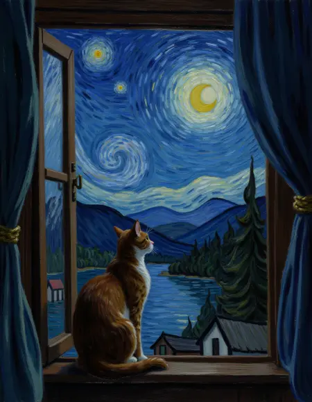 버전 1.0은 캡션 없이(트리거만 사용) 트레이닝되었습니다. LoRA를 전체 강도(1)로 사용할 때 트리거 단어 "starry_night1"을 사용하세요. 이는 개념 증명으로서 매우 훌륭한 결과를 냈으며, 단 390단계만으로 트레이닝되었습니다. 제한된 데이터셋 다양성을 가진 대부분의 캡션 없는 LoRA와 마찬가지로, 복잡한 프롬프트에 대한 일반화 능력이 떨어지지만, 간단한 지시로는 훌륭한 이미지를 생성합니다.