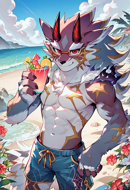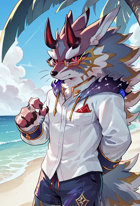 Illustrious: best quality, amazing quality, very aesthetic, absurdres, newest, bael, housamo, tokyo afterschool summoners, furry, 1boy, solo, furry male, horns, red eyes, animal ears, colored sclera, black pupil, looking at viewer, ...your tags...
