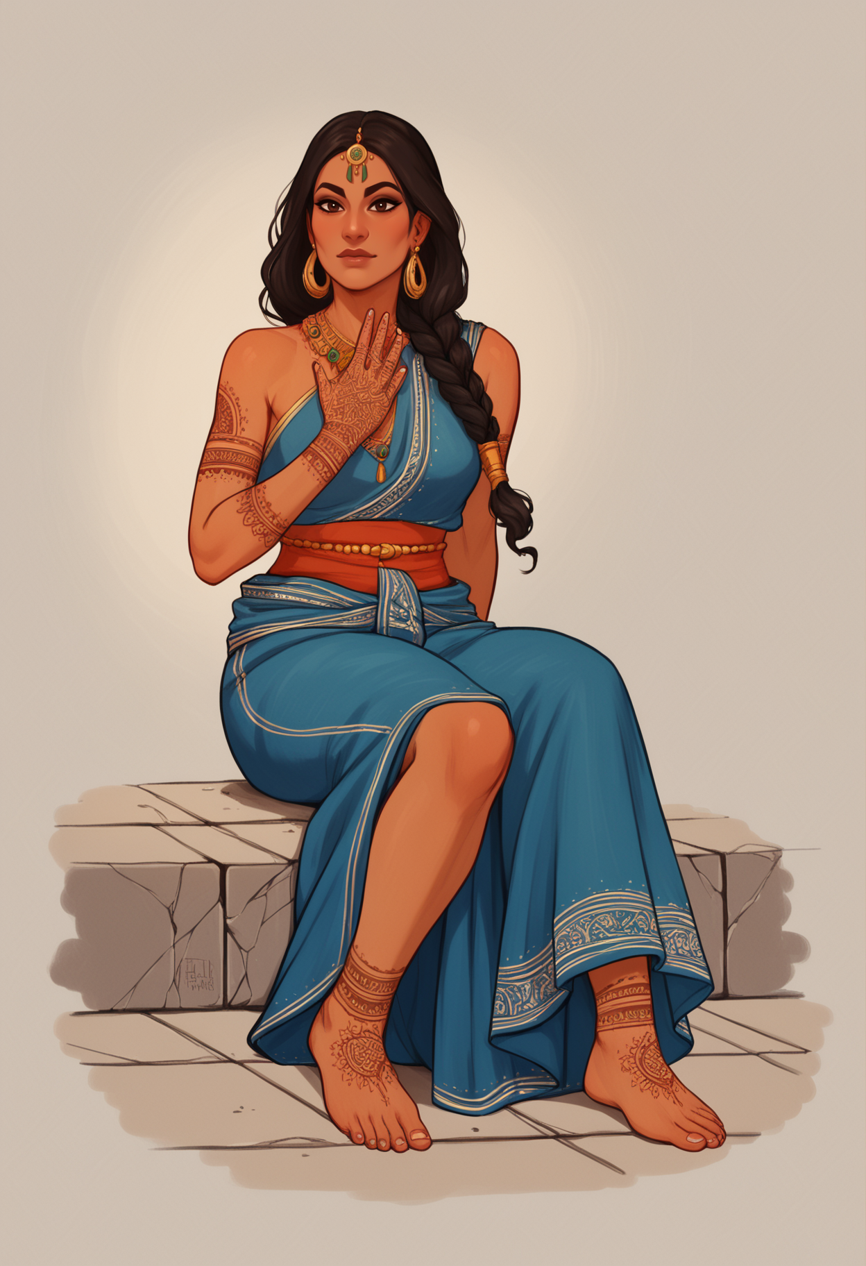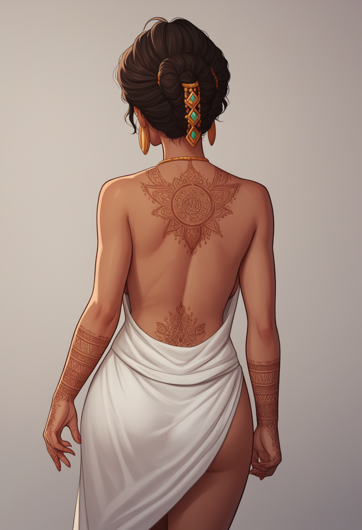 20장의 이미지(그림 및 사진 혼합)를 기반으로 한 개념 모델: 메힌디 신체 예술. 메힌디는 헤나 식물에서 만든 페이스트를 사용하는 비영구적인 신체 '타투' 전통 형식으로, 남아시아, 특히 인도 아대륙에서 인기 있으며, 결혼식에서 여성들이 자주 착용한다.