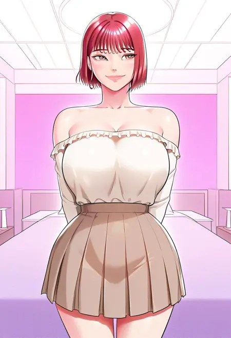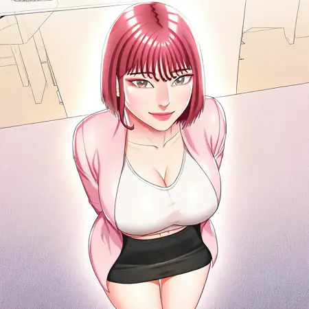 ((粉色夹克,白色上衣,露骨乳沟,巨大乳沟,露腹,黑色铅笔裙)) + 白色袜子,白色运动鞋,黑色背包,