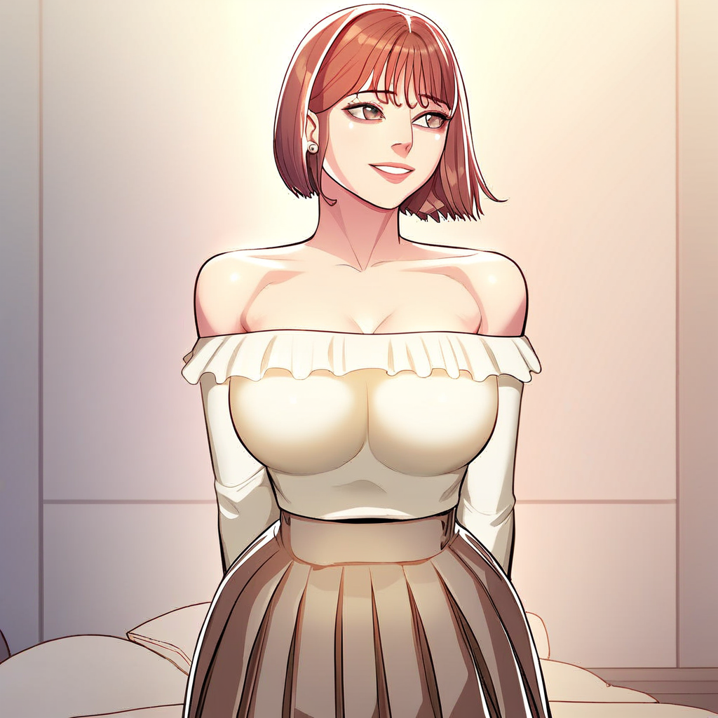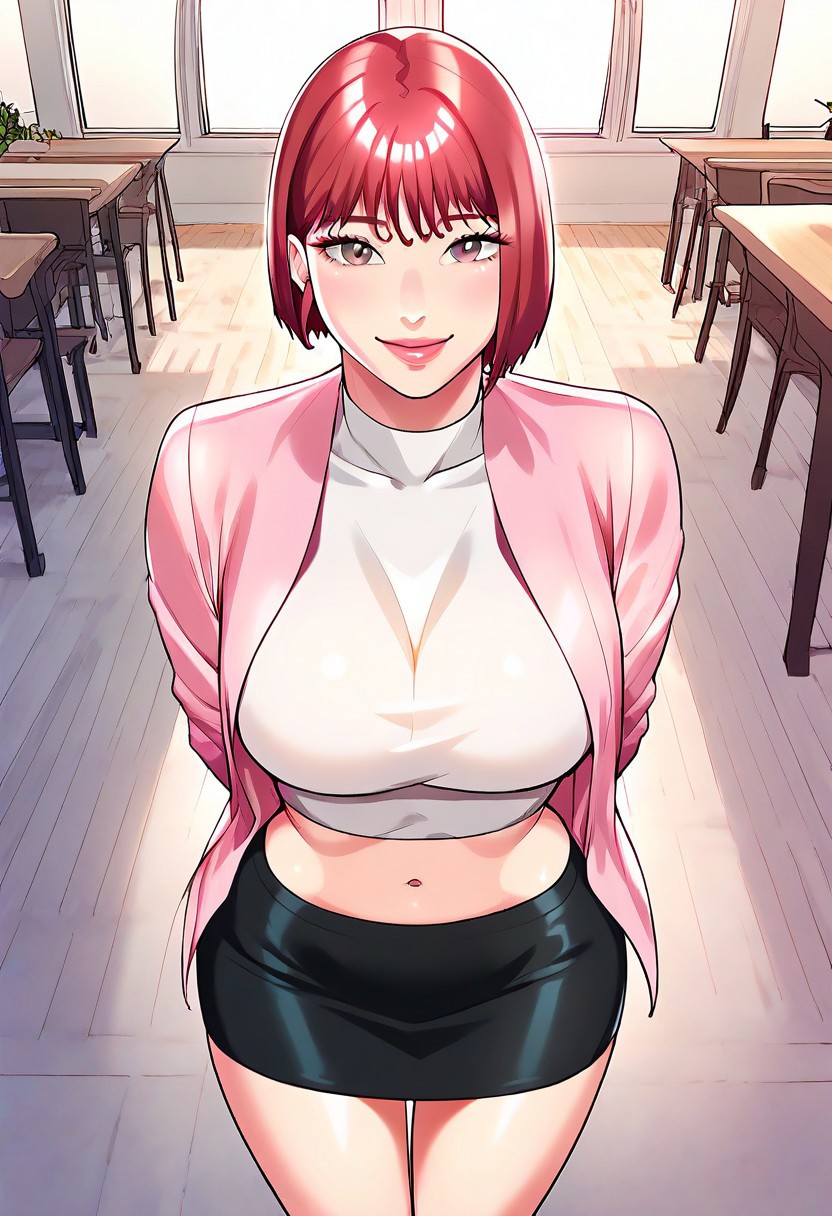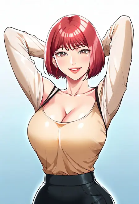 (( lora:jung\_hye-yoon:1 , jung_hye-yoon, thin waist, wide hips, beautiful skin, piercing light brown eyes, clear eyes, bright pupils, beautiful eyes, beautiful red hair, beautiful short hair, bangs, huge and shaggy breasts, natural beauty, extraordinary beautiful woman, attractive woman, super sexy woman, lustful body, sexy woman with seductive obscene body, sensual body, voluptuous body, sexy beauty, no piercings, no piercing, ))
