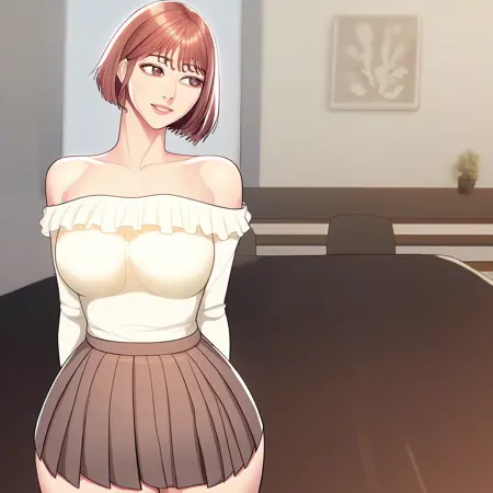 4a. ((beautiful off-shoulder long-sleeves white top with frills, pleated brown skirt, ))