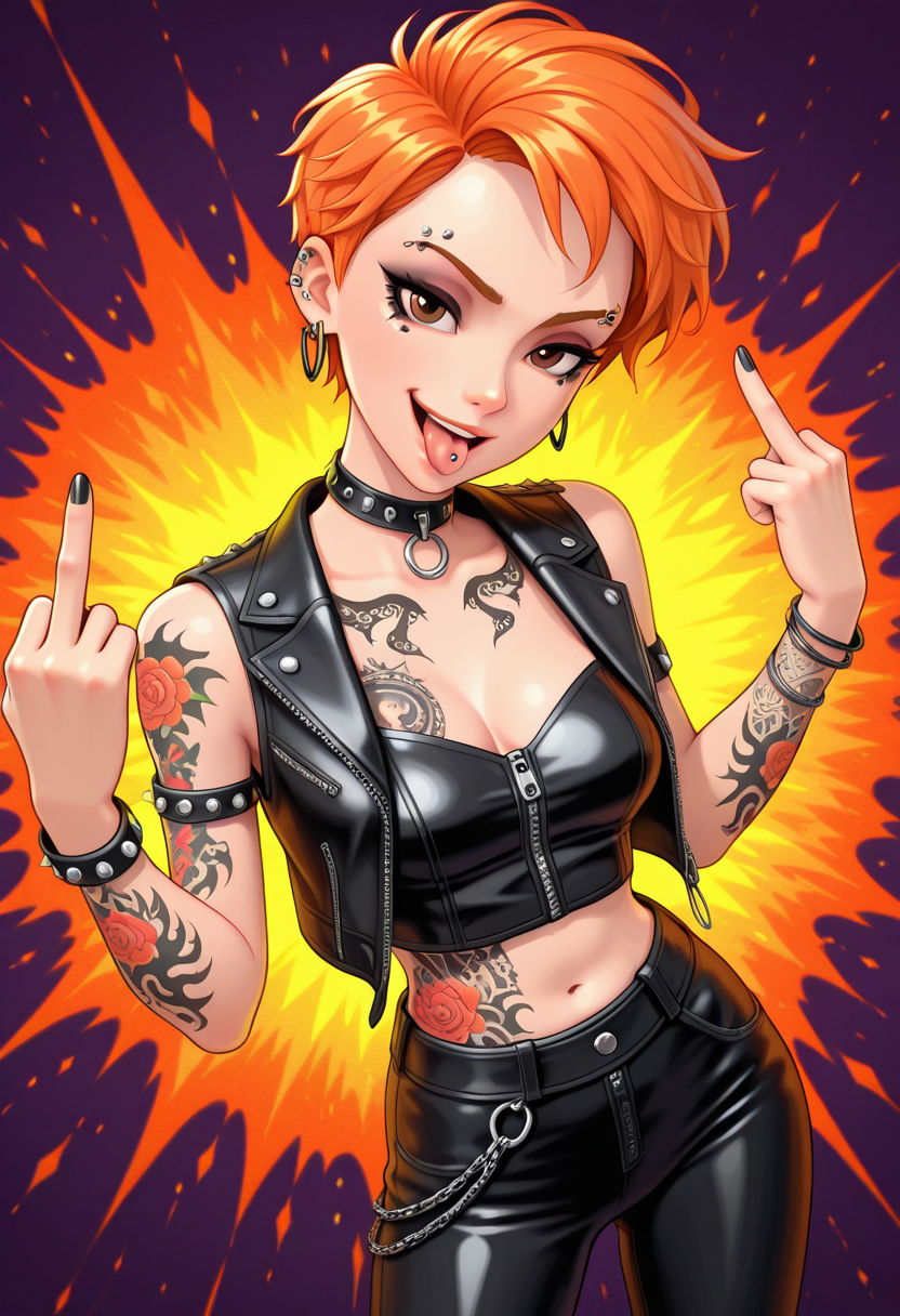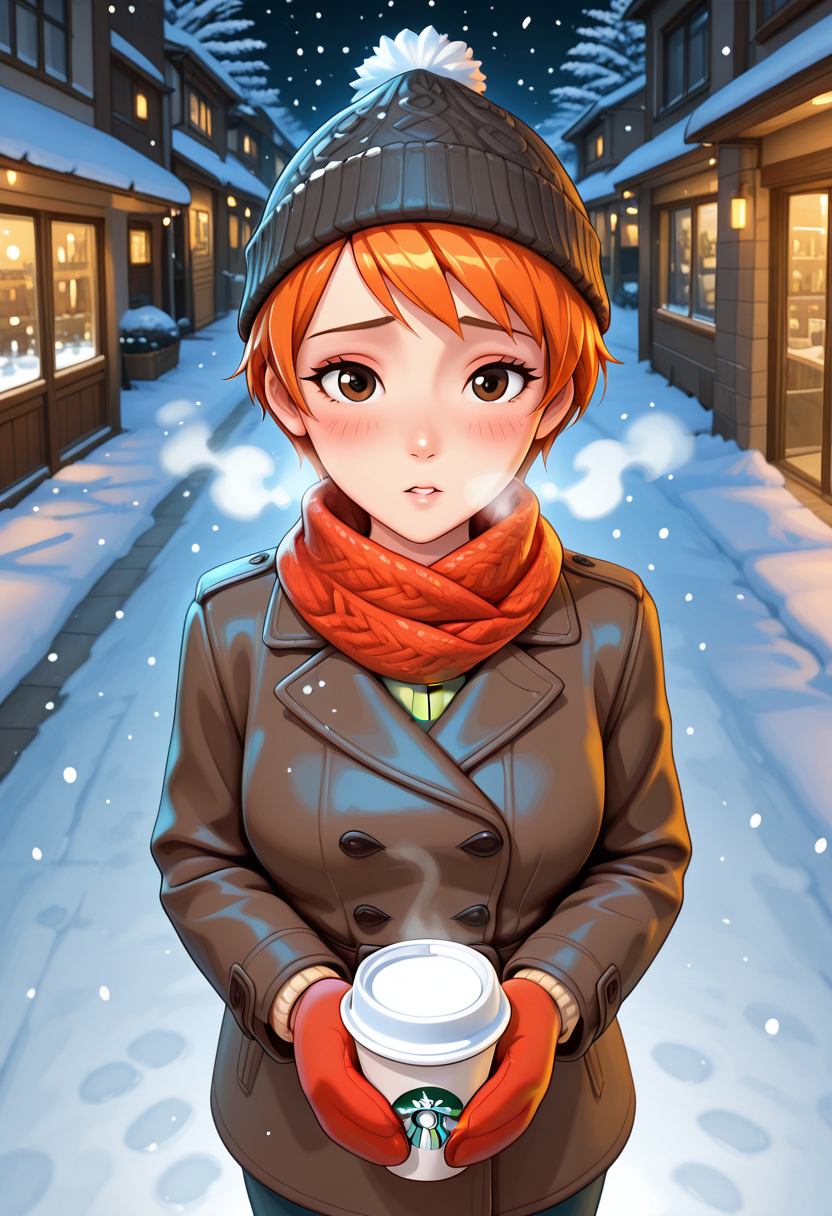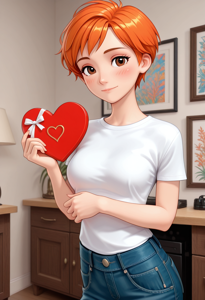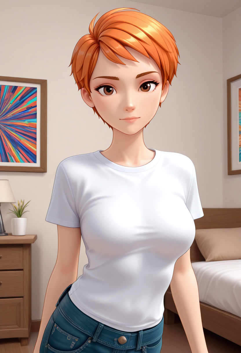 short hair, orange hair, brown eyes,