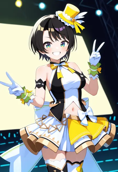outfit3ccsubaru, short hair, black hair, mini top hat, yellow headwear, multicolored eyes, breasts, idol, yellow bowtie, sleeveless shirt, arm strap, wrist cuffs, white gloves, navel, white bow, layered skirt, white skirt, asymmetrical legwear, thighhighs
