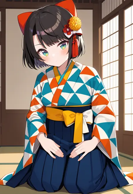outfit4ddsubaru, short hair, black hair, tassel hair ornament, multicolored eyes, breasts, print kimono, multicolored kimono, long sleeves, wide sleeves, sash, hakama skirt, blue skirt