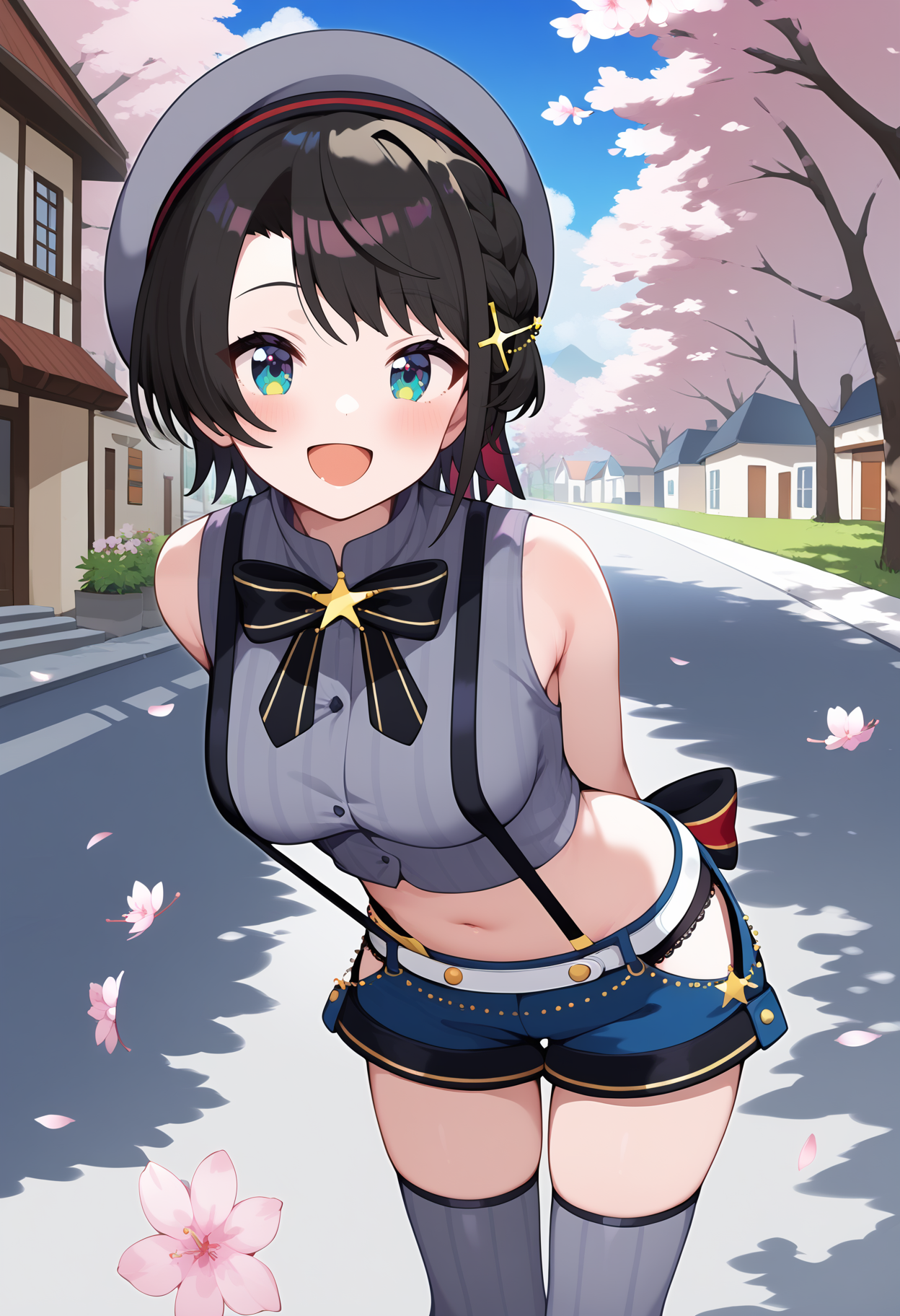 outfit2-1bbsubaru, short hair, black hair, french braid, hairclip, grey headwear, multicolored eyes, breasts, sailor collar, black bowtie, crop top, cropped jacket, blue jacket, long sleeves, suspenders, midriff, blue shorts, hip vent, grey thighhighs