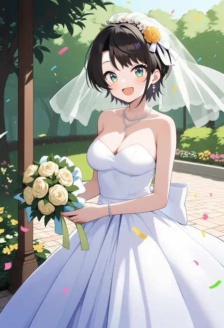 outfit7ggsubaru, short hair, black hair, white headwear, hat flower, multicolored eyes, breasts, bowtie, crop top, cropped jacket, yellow jacket, short sleeves, white gloves, suspenders, midriff, short shorts, black shorts, yellow skirt, garter straps, white thighhighs