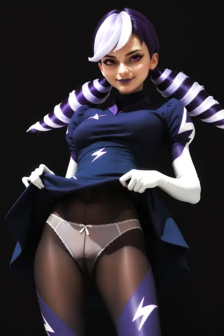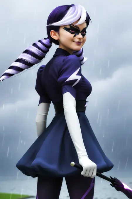 风暴天气提示词:1girl, dress, multicolored hair, two-tone hair, purple hair, white hair, drill hair, long hair, twintails, twin drills, mask, domino mask, makeup, purple eyes, lipstick, gloves, pantyhose, elbow gloves, purple lips, puffy short sleeves