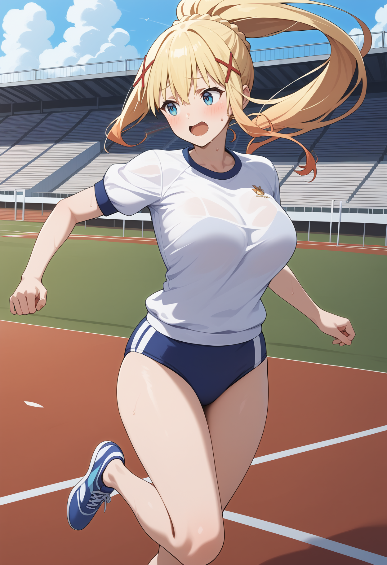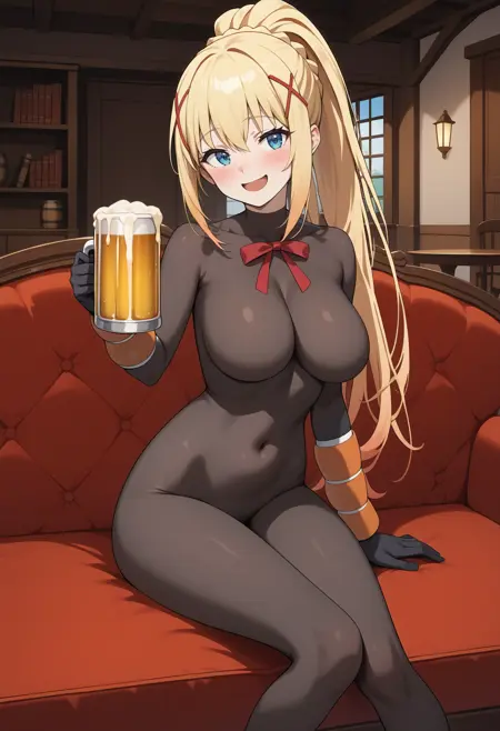 outfit2aadarkness, long hair, blonde hair, braid, ponytail, x hair ornament, blue eyes, large breasts, red ribbon, skin tight, bodystocking, wrist guards, black gloves