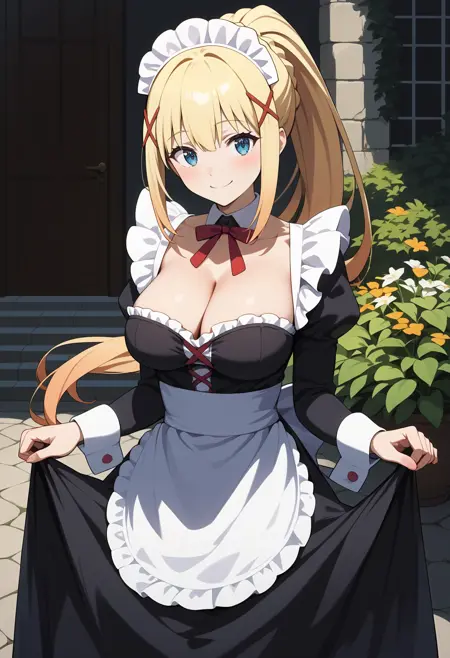 outfit1aadarkness, long hair, blonde hair, braid, ponytail, x hair ornament, blue eyes, large breasts, red ribbon, shoulder armor, breastplate, armored dress, yellow dress, wrist guards, black gloves