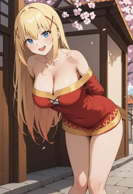 outfit3aadarkness, long hair, blonde hair, x hair ornament, blue eyes, large breasts, cosplay, collarbone, bare shoulders, off shoulder, cleavage, short dress, red dress, long sleeves, bare legs