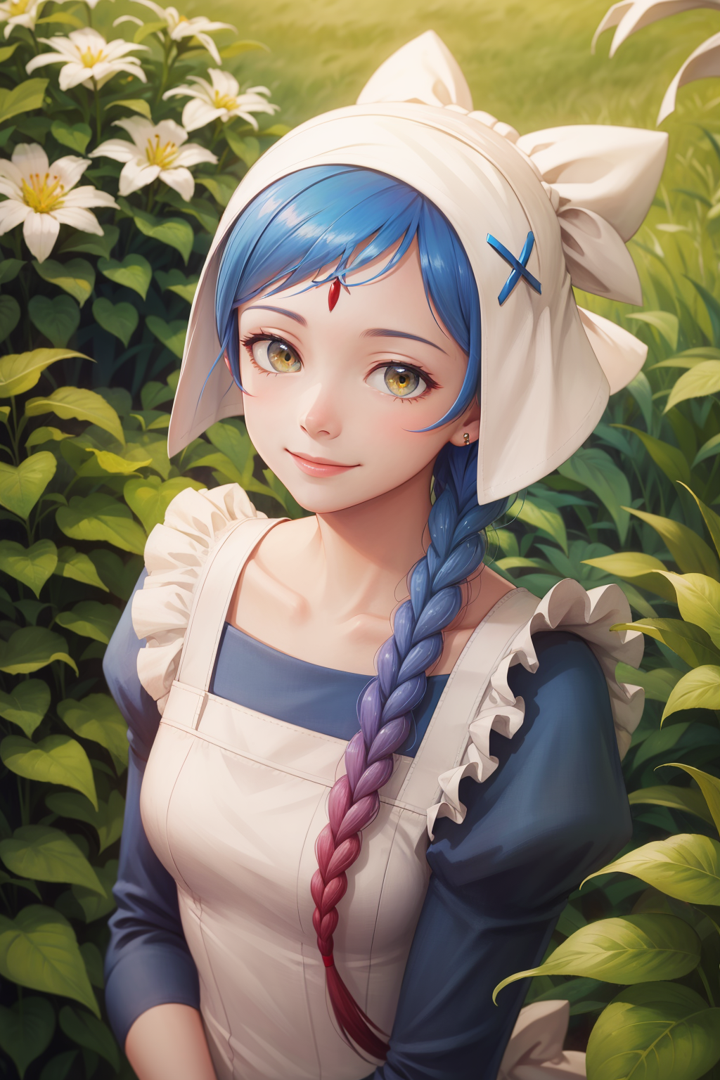 添加“头巾,额头宝石,单条辫子,蓝色连衣裙,白色围裙,膝上靴”以呈现她典型的外观。