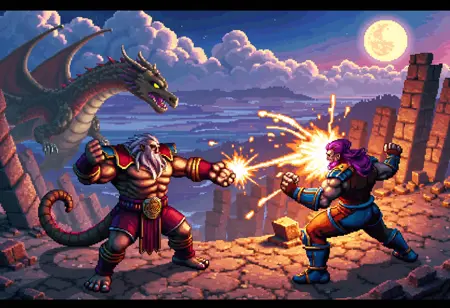 Experience a richer, more colorful era with this 16-bit LoRa, designed to capture the detail and depth of classic games. The dataset includes specific layout types—"overhead view RPG", "side-scrolling platformer", "fighting game", "racing game", and "isometric RPG"—making it versatile for different kinds of game visuals. Include the layout keywords and use prompts that match these layout types will get you the best results; for example, a closeup portrait won’t generate a racing game image :-).8Bit