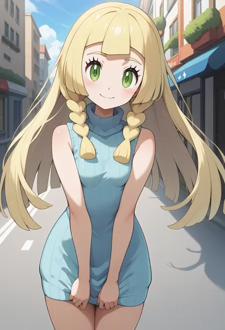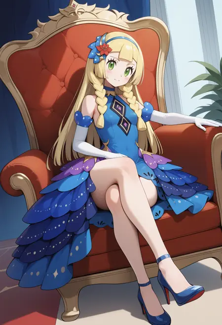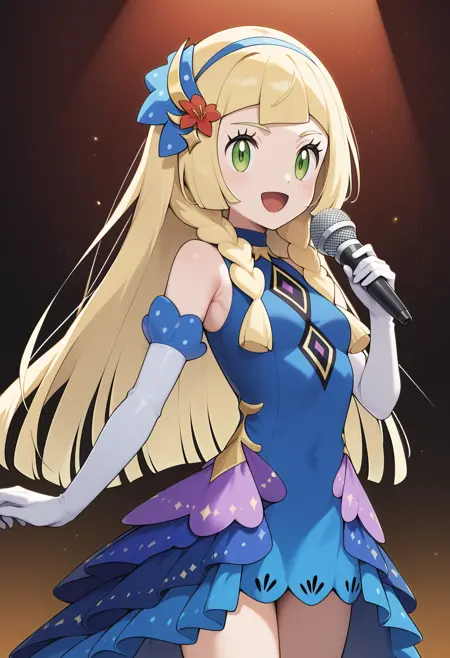 outfit3aalillie, long hair, blonde hair, twin braids, blue hairband, hair flower, hair ornament, green eyes, small breasts, blue dress, sleeveless, elbow gloves, white gloves