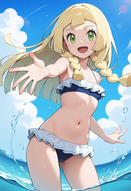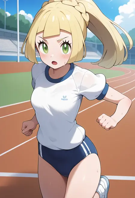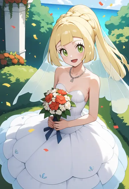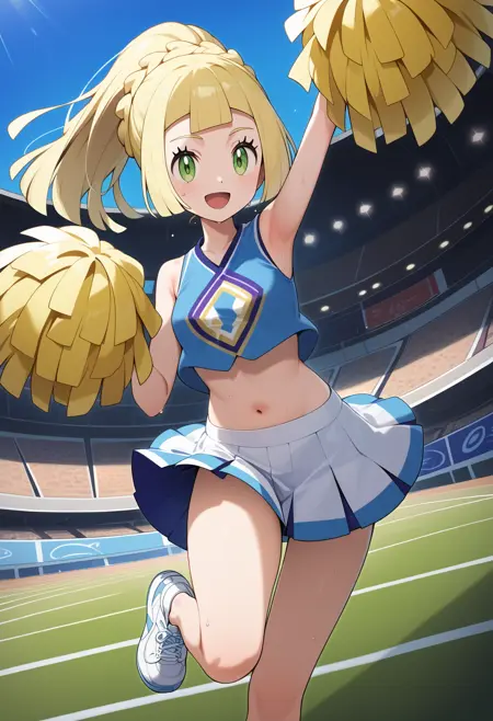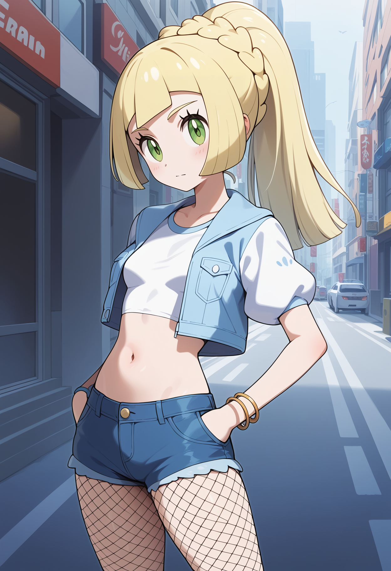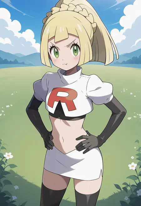 outfit5-2 (ponytail)aalillie, long hair, blonde hair, french braid, ponytail, green eyes, small breasts, cosplay, team rocket uniform, crop top, white jacket, elbow gloves, black gloves, midriff, miniskirt, white skirt, black thighhighs