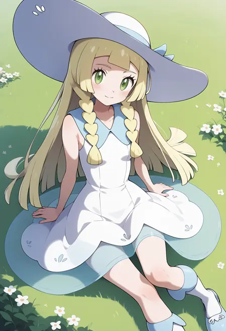 outfit1aalillie, long hair, blonde hair, twin braids, sun hat, white headwear, green eyes, small breasts, collared dress, white dress, sleeveless, see-through