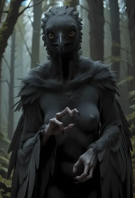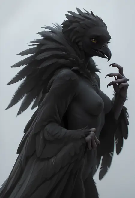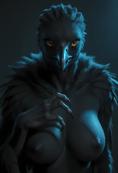 1girl, no humans, bird, beak, claws, wings, monster, eyelashes, feathered wings, furry, breasts, yellow eyes