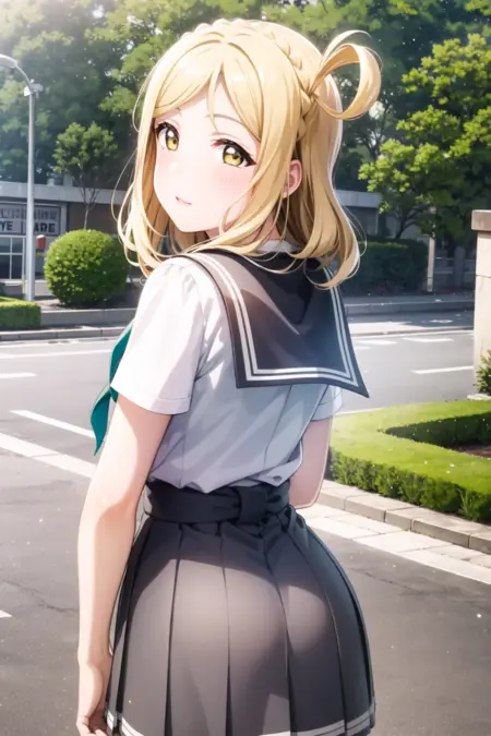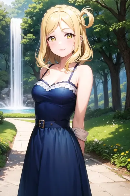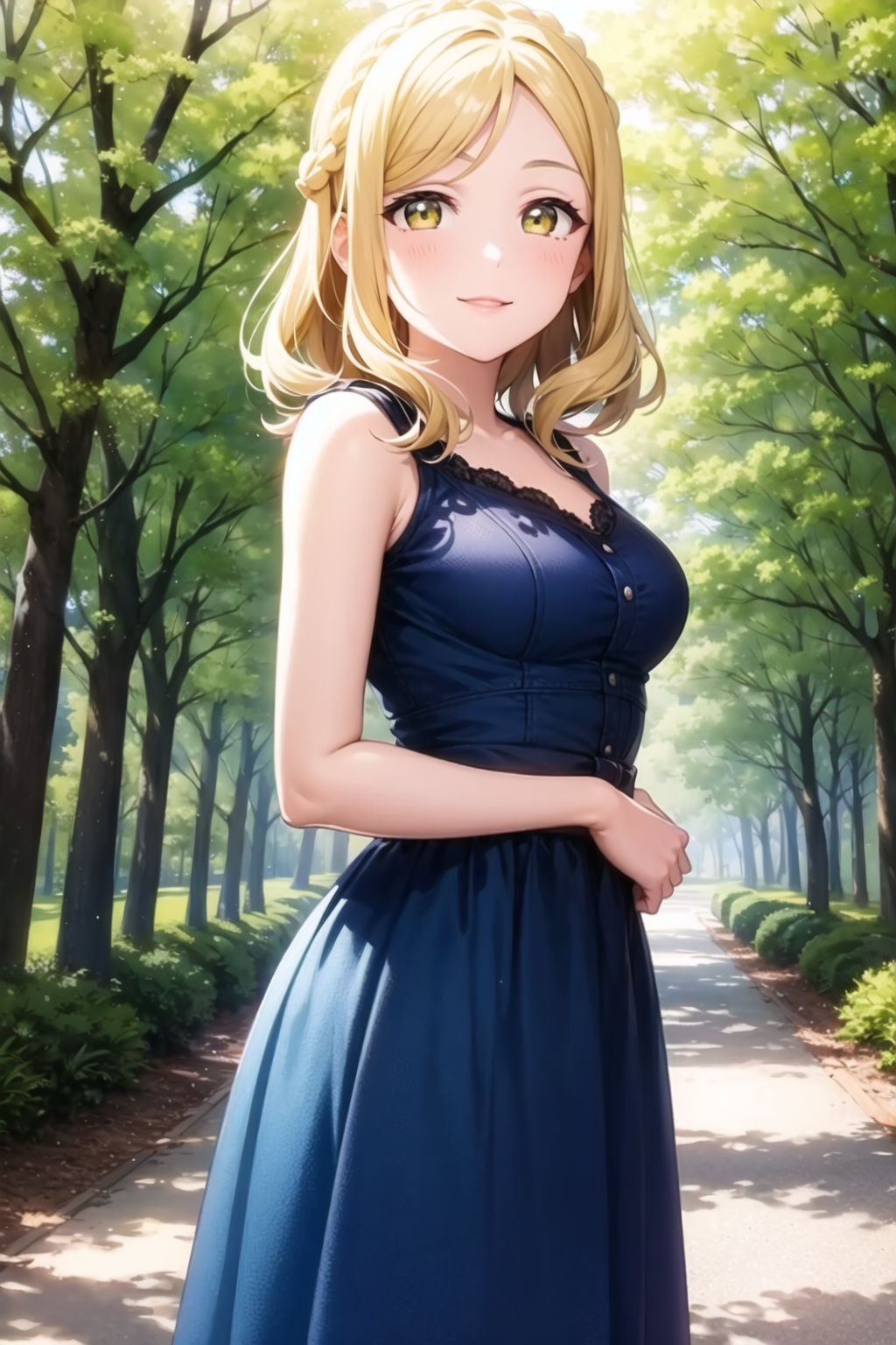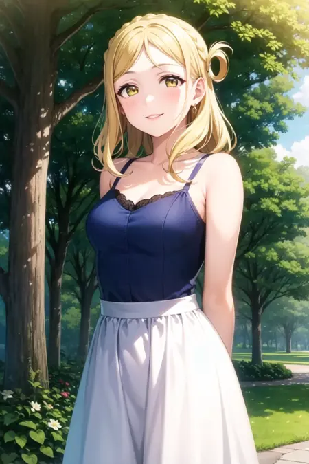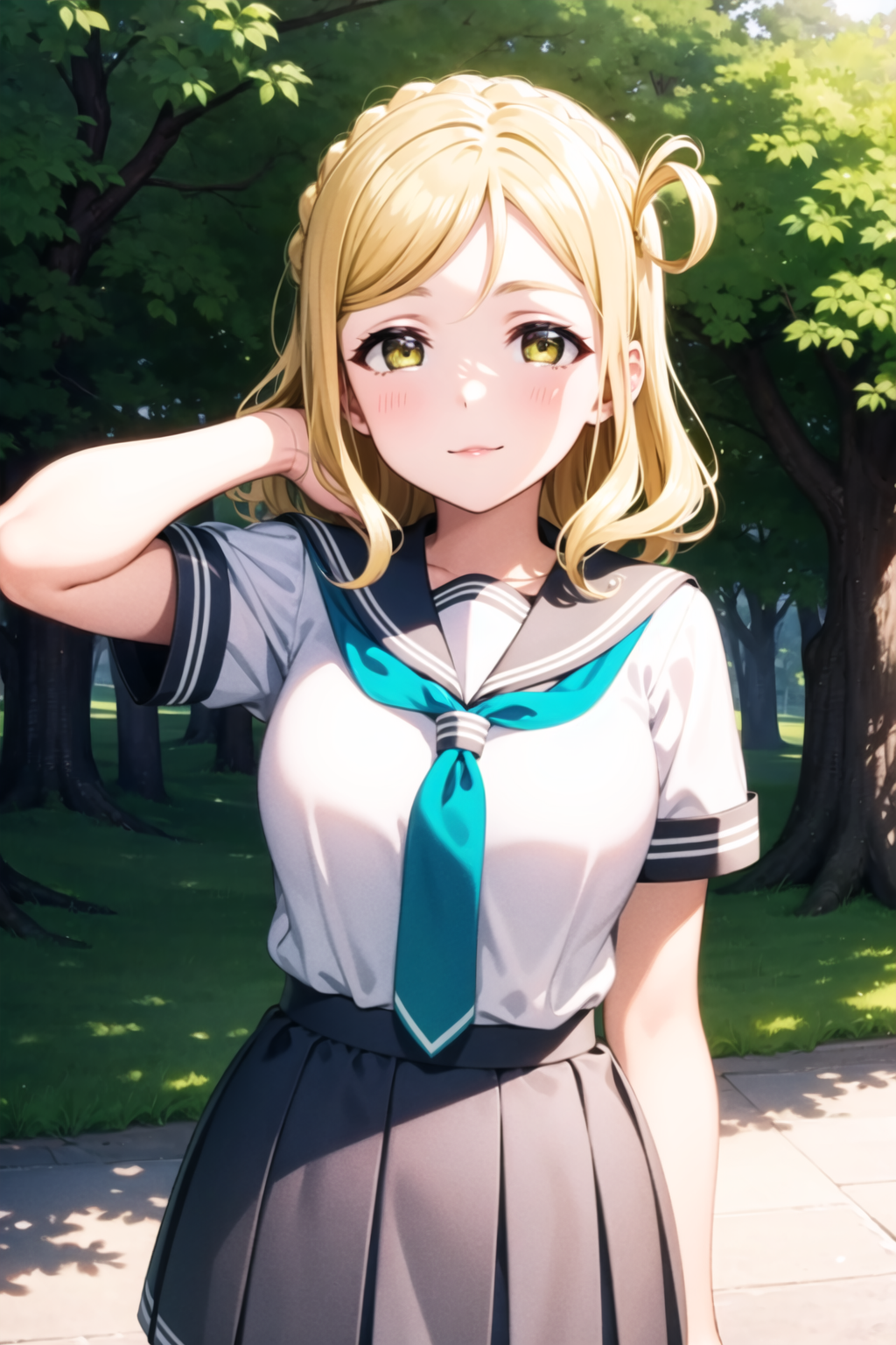 Tags you'll need: 1girl, solo, ohara mari, hair rings, blonde hair, yellow eyes, crown braid,