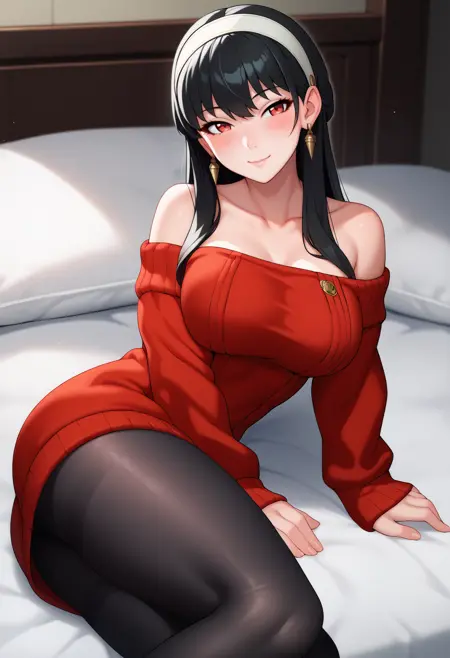 默认服装: y0rdef, 黑色头发, 短发搭配长发束, 白色发带, 红色眼睛, 红色毛衣, 毛衣连衣裙, 露肩毛衣, 长袖, 黑色连裤袜, 金色耳环, 裸露肩膀, 锁骨