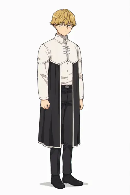 white shirt, black drape, black pants, black footwear