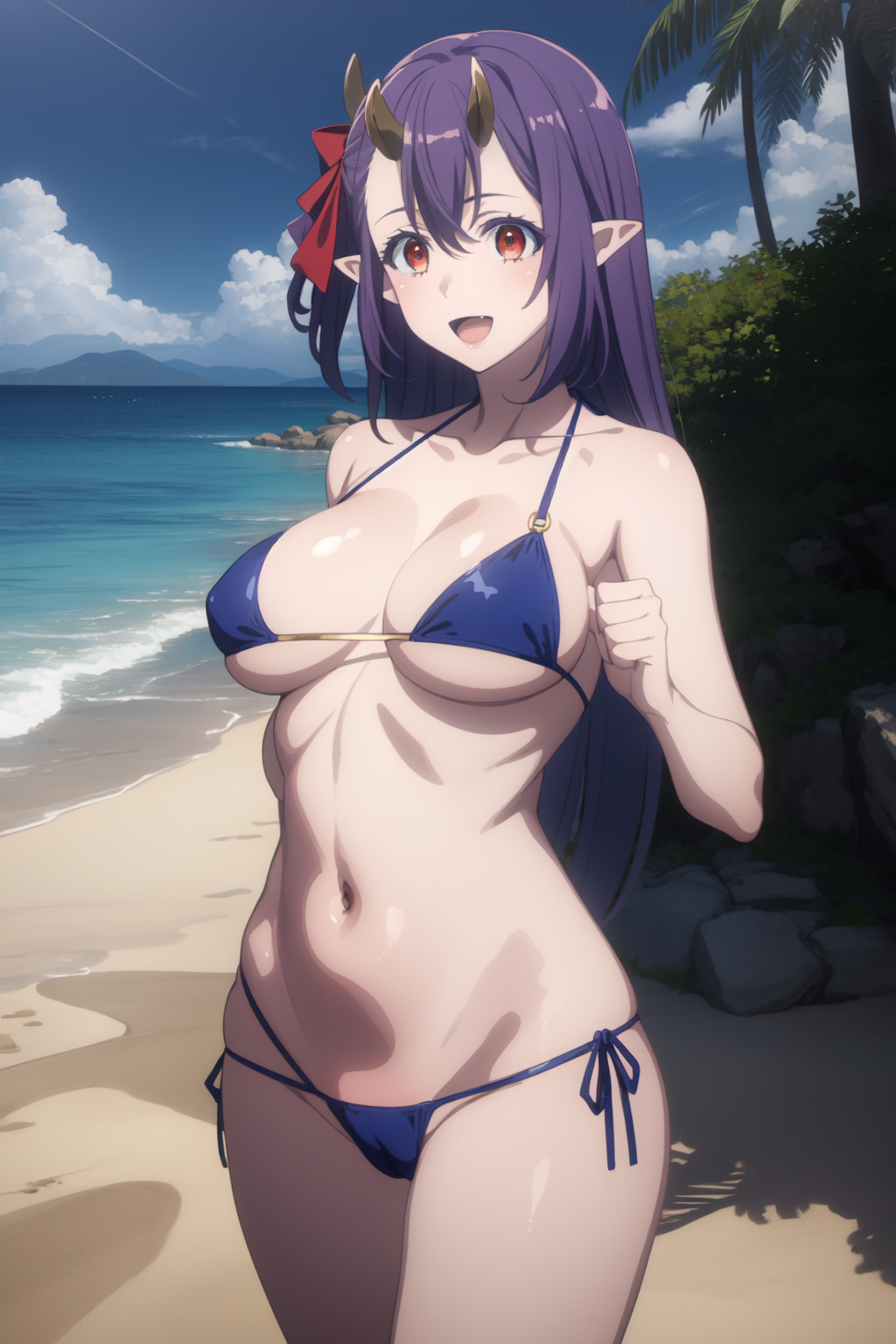 紫色头发,红色眼睛,角,衣服上有文字,金属腰带,长发,肚脐,尖耳朵,衬衫,一侧扎起的衬衫,迷你裙,条纹,条纹裤袜,及膝长袜