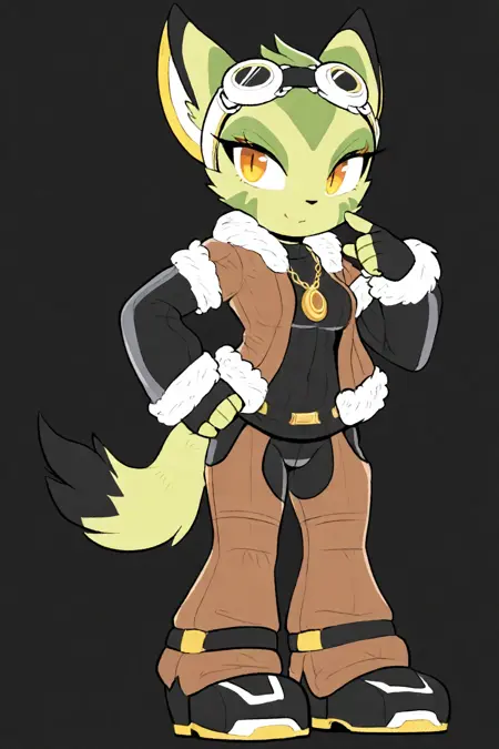 Helpful: gold necklace, goggles, open clothing, open jacket, brown fur-trimmed jacket, fingerless gloves, fur-trimmed gloves, black bodysuit, brown pants, crotchless bottomwear, black-white boots,