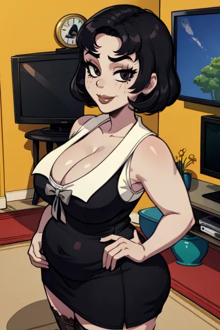 Toot, black eyes, black hair, makeup, or black lips, medium hair, freckles,