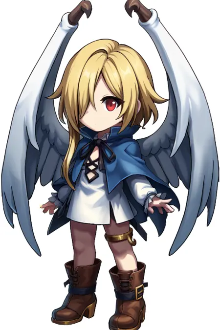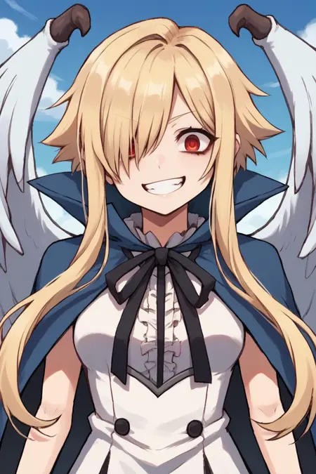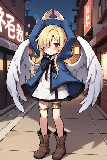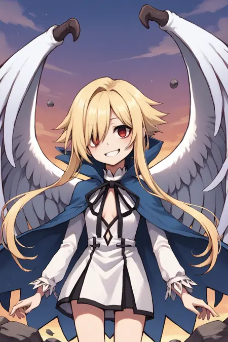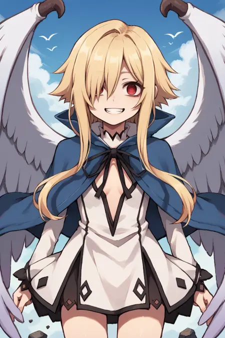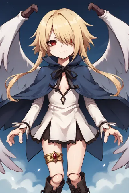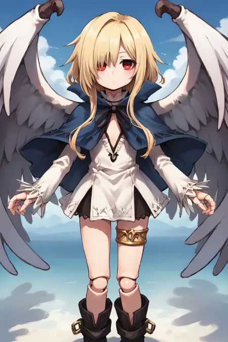 • Awakened: thrdef, 1girl, blonde hair, long hair, medium hair with long locks, (hair over one eye), red eyes, wings, white wings, feathered wings, dress, white dress, short dress, blue cloak, popped collar, neck ribbon, black ribbon, center opening, long sleeves, thighlet, boots