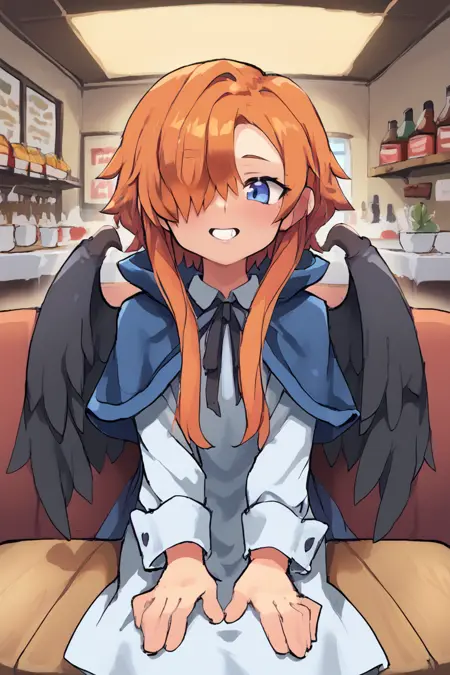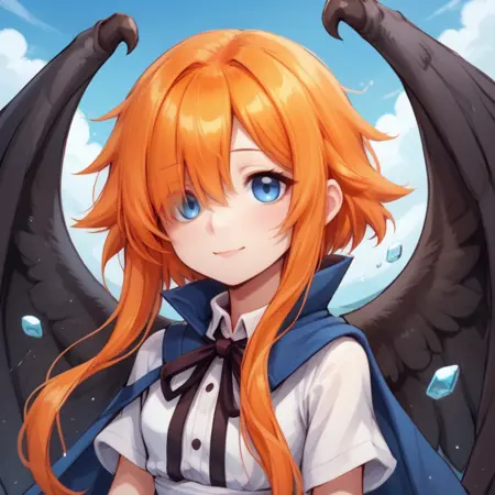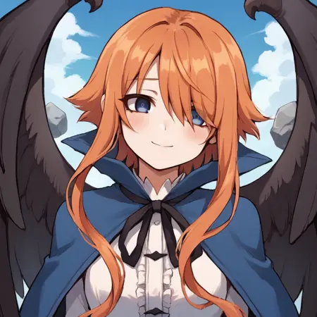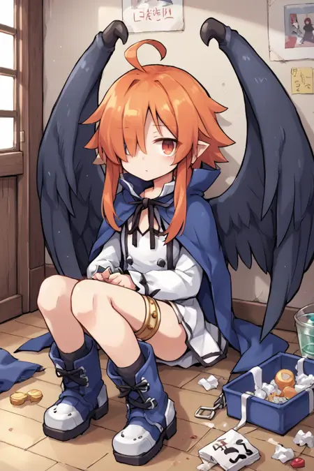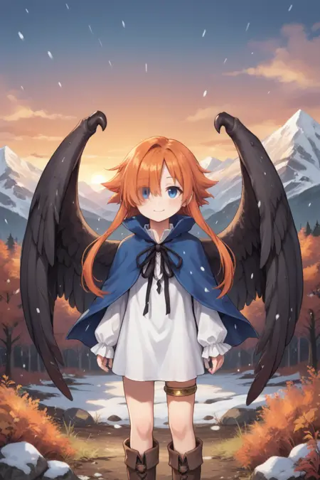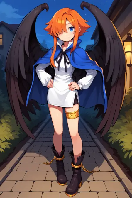 • Base: thrdef, 1girl, orange hair, long hair, medium hair with long locks, (hair over one eye), blue eyes, wings, black wings, feathered wings, dress, white dress, short dress, blue cloak, popped collar, neck ribbon, black ribbon, center opening, long sleeves, thighlet, boots